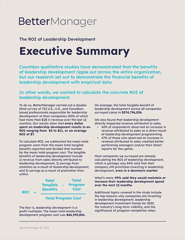 Return on Investment: Leadership development yields impressive ROI ranging from $3 to $11, or an average ROI of $7.
